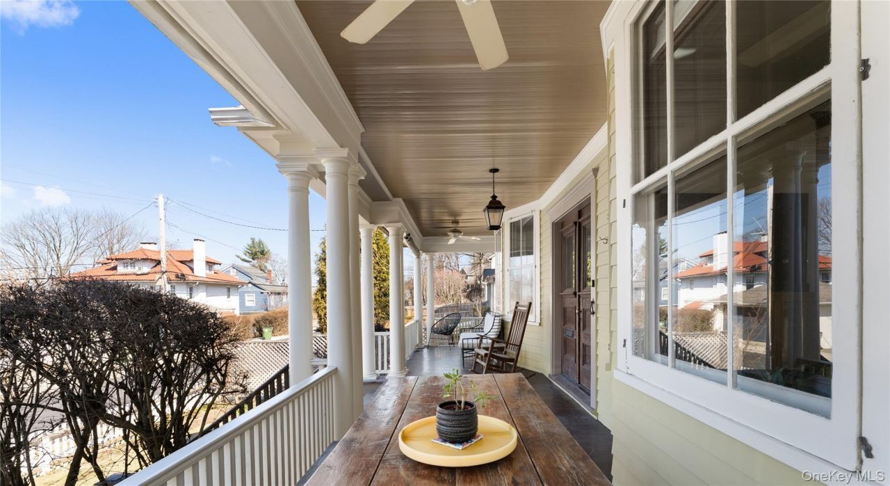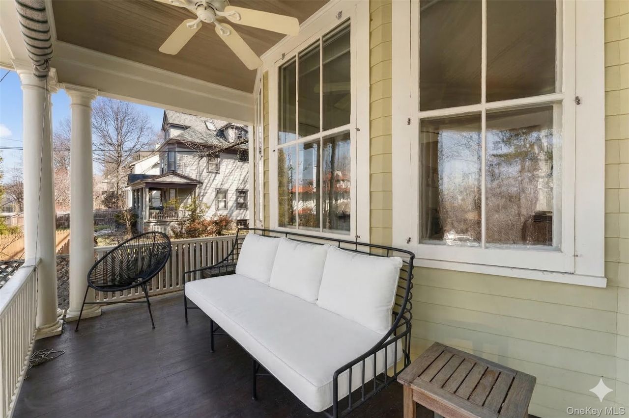 Commanding a premier position in one of Tarrytown's most desirable neighborhoods, 70 Fairview Avenue perfectly captures the essence of sophisticated Rivertown living. This stunning home welcomes you with an expansive rocking-chair front porch, featuring a classic beadboard ceiling and cooling fan, the ideal vantage point to enjoy elevated Hudson River views and spectacular sunsets. Inside, the home's historical integrity is showcased through soaring high ceilings, exquisite dental moldings, and beautiful hardwood floors. The sun-drenched living room is anchored by a striking, modern wood-burning stove and framed by large bay windows that invite the river views inside. The main level flows seamlessly into a formal dining room adorned with elegant wainscoting and custom floor-to-ceiling built-ins, leading to a bright, updated kitchen featuring honeycomb tile backsplashes, open shelving, and a charming breakfast nook with built-in banquette seating. The home's layout is designed for both scale and storage, offering excellent closet space. The crown jewel is the finished third floor, a versatile office and entertaining space with panoramic river views that provide an inspiring backdrop for creativity or relaxation. Outside, find a rare Tarrytown treasure: a perfectly flat, fenced-in backyard. This level lot is an ideal setting for entertaining and gardening. Beyond the property line, the very best of Tarrytown is within immediate reach. You are just moments from downtown's world-class dining, boutique shops, and the historic Tarrytown Music Hall. For those heading into the city, the commute is effortless, with the Metro-North station situated just down the hill for a scenic express ride to Grand Central.